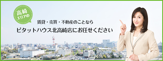 ピタットハウス北高崎店は、賃貸・売買・管理の総合不動産ショップです。 マンション・アパート・テナントなどの賃貸物件や、中古マンション・中古住宅・売土地・投資物件・買取査定など 専門スタッフがご対応させていただきます。 空室でお悩みのオーナー様、マンション・アパートなど安心の管理システムと独自の宣伝広告で、しっかりサポートいたします。 その他、競売や任意売却など、不動産に関することならなんでもお気軽にご相談ください。